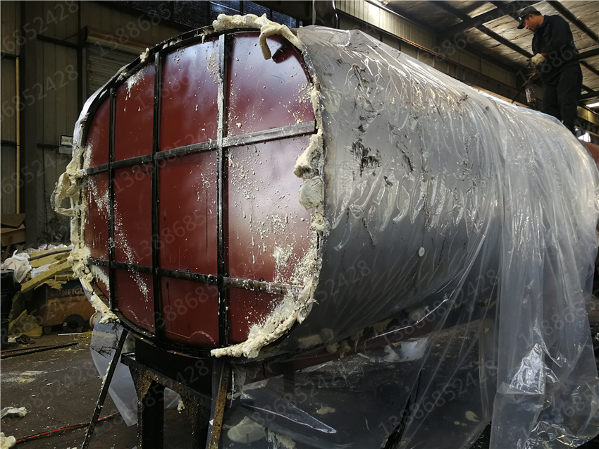 另一種是聚氨酯泡沫保溫。聚氨酯泡沫材料的填充是用專用發泡機將化學生成的泡沫噴在罐體和骨架之間。噴灑時慢慢堆積成型,使泡沫材料更加緊密。對于多余的泡沫或高于骨架外表面的泡沫,用鏟子打磨。外表面覆蓋一層0.8毫米厚的冷軋板,通過抽芯鉚釘將冷軋板固定在骨架上。