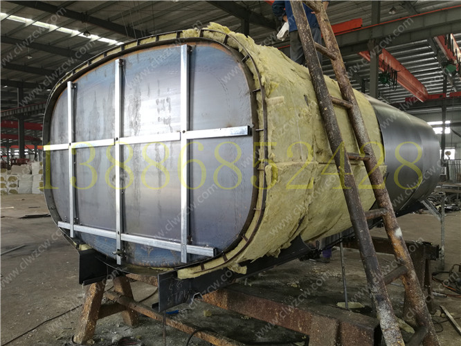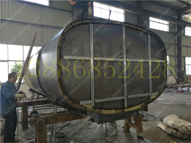 3. 保層溫的制作是在水罐外部另外焊接10mm厚的支撐骨架,然后用保溫材料將骨架內(nèi)部填充滿(mǎn),最后在骨架外蒙上一層外皮。 保溫層外表鐵皮采用8mm厚高強(qiáng)度耐磨板,可選擇使用不銹鋼分鏡面8K或磨砂板