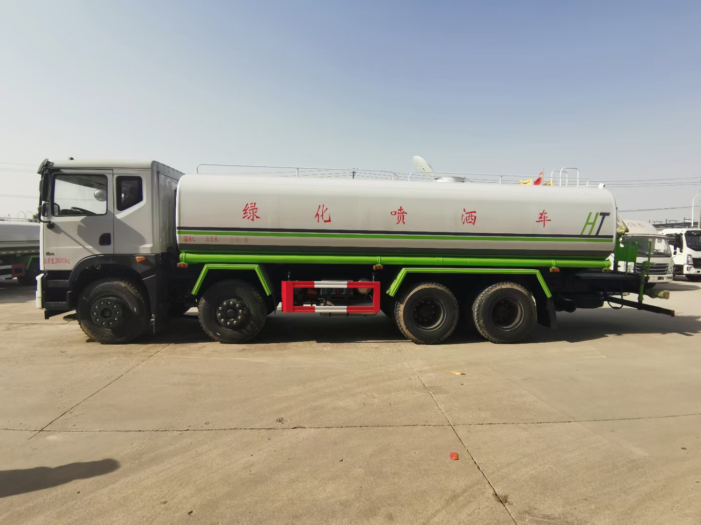 整車型號:HTX5316GPSL6型綠化噴灑車,浩天星運牌,底盤型號EQ1310GL6DJ ,發動機為玉柴270馬力(YCS06270-60)國六排放標準,軸距1850+3200+1350mm,華神T5駕駛室,陜齒大八檔變速箱(SC-8JS118TC-B)帶法蘭式取力器,5t雙前橋/10t后橋,11.00R20鋼絲胎,車架280mm,空調,氣囊座椅,中控,多功能方向盤,行駛記錄儀。上裝:罐體采用標準Q235碳鋼制作,罐體自動焊,裝水25噸,配大功率專用灑水車,可自吸自排,前沖后灑,側噴,高位花灑,主管道加粗,大通徑球閥,直通球閥式消防接口,帶后工作平臺,沖孔平臺,帶高炮。(可選裝大平臺,可裝30米霧炮降塵)。